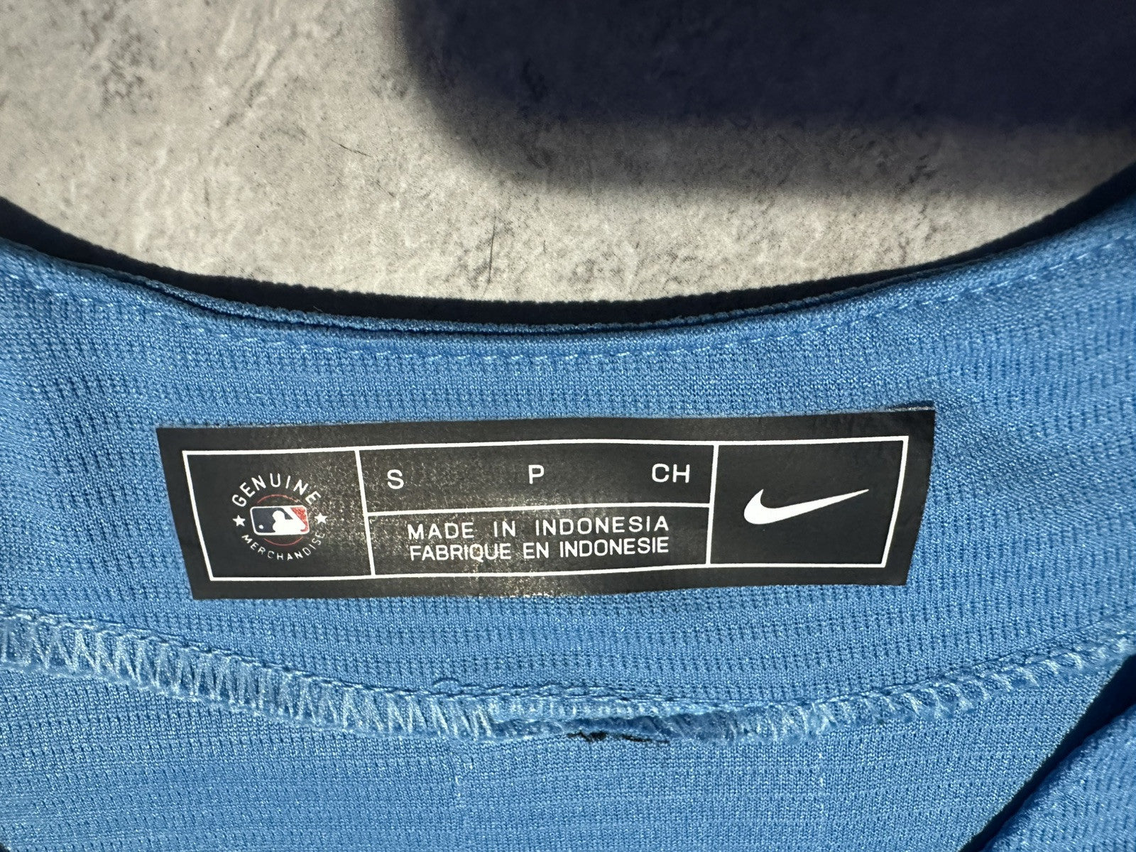 Elevate your game day ensemble with the sleek Nike Philadelphia Phillies jersey featuring pitcher Zach Wheeler. In a striking powder blue, this jersey is a must-have for any die-hard fan or collector. The size small fit is designed for a comfortable and stylish wear, whether you're at the stadium or just showing your team spirit around town.
