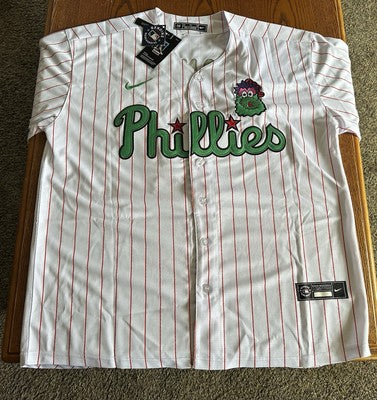 Embrace your little fan's enthusiasm for the Philadelphia Phillies with this vibrant Kid’s Youth PHANATIC Jersey. A vivid white backdrop sets the stage for the iconic Phillie Phanatic logo, ensuring your child stands out in the crowd. Crafted by Nike, this jersey promises both comfort and durability, making it perfect for those energetic game days or casual outings.