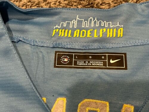 Show off your support for the Philadelphia Phillies with this Nike Trea Turner City Connect Jersey. The blue jersey features the player's name and number on the back, and is made for men in size Large. Perfect for any Major League baseball fan, this jersey is made with high quality materials to ensure comfort and durability. Represent your favorite team in style with this authentic Nike jersey.