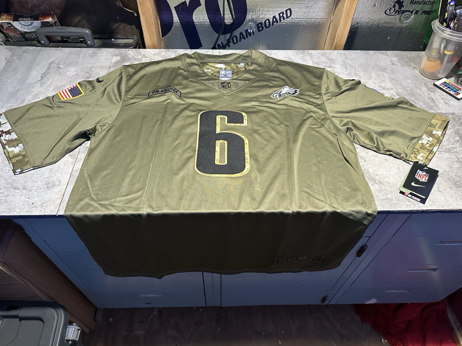 Show your support for the Philadelphia Eagles with this new Nike jersey featuring DeVonta Smith. This jersey is perfect for any fan, especially those who want to honor military veterans. The size is XL and it is designed for men. It is made of high-quality materials. Get yours today and wear it proudly on game day or any other occasion.