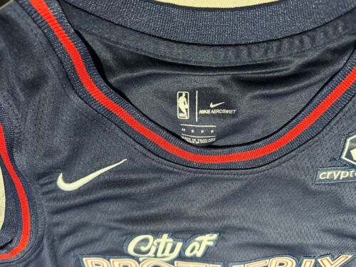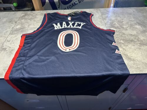 The product is a new Tyrese Maxey City Of Brotherly Love 76ers Sixers Jersey in size small. It is a men's jersey made by Nike and is part of the National Basketball Association (NBA) league. The jersey is designed for regular season basketball games and is associated with the Philadelphia 76ers team. The jersey is blue in color and features the team's logo.