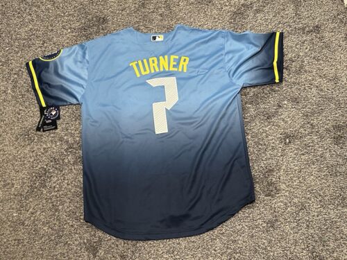 Show off your support for the Philadelphia Phillies with this Nike Trea Turner City Connect Jersey. The blue jersey features the player's name and number on the back, and is made for men in size 3XLarge. Perfect for any Major League baseball fan, this jersey is made with high quality materials to ensure comfort and durability. Represent your favorite team in style with this authentic Nike jersey.