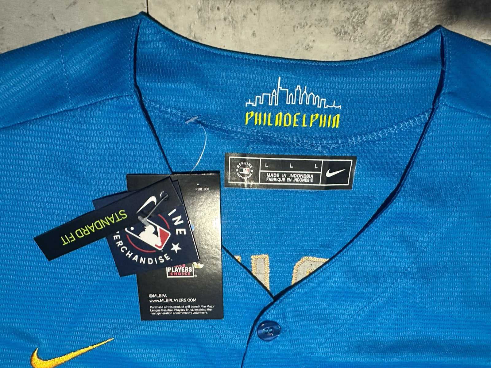 Step up your game day attire with the Nike Philadelphia Phillies City Connect Alec Bohm Jersey. This blue jersey, adorned with the iconic Phillies logo and Bohm's name, is a must-have for any dedicated fan. Sized large, it's comfortable for all-day wear and perfect for showing your support during the biggest games of the season.