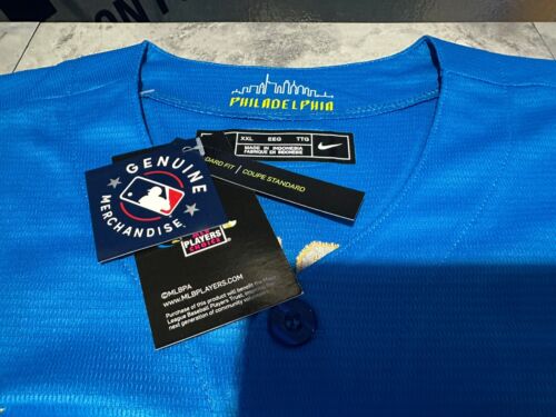 Show your support for the Philadelphia Phillies with this officially licensed Nike Bryce Harper City Connect Jersey. The blue jersey features the team's logo on the front and Bryce Harper's name and number on the back. It is made for unisex children in size 2XL and is perfect for any young baseball fan.